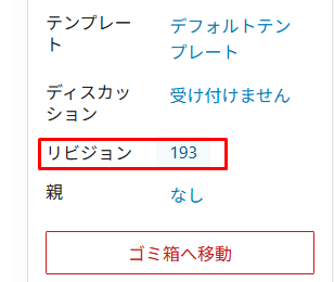 この場合は、落ち着いて、編集画面の右側の「固定ページ」タブをクリックして、「リビジョン」の横の数字をクリックします。