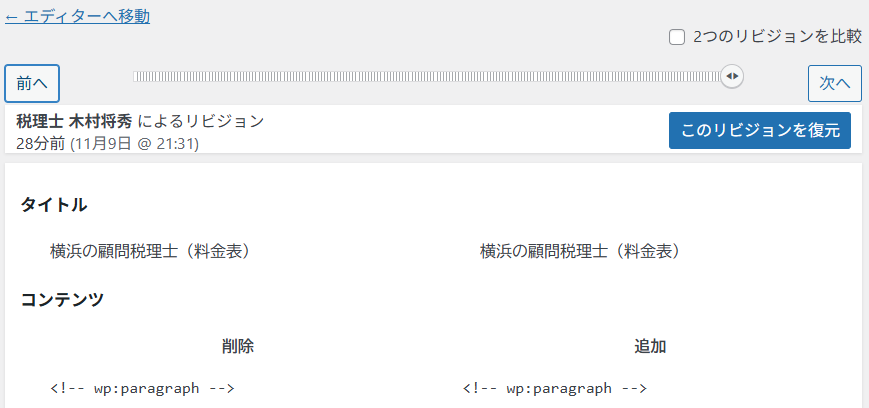 目当てのリビジョンが表示されたら、そこで「このリビジョンを復元」をクリックすれば、誤って古いバージョンで上書きする前のデータに戻せます。