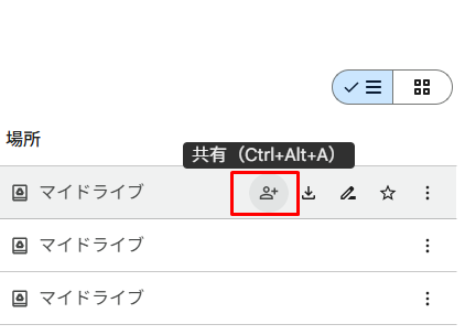 その後、Google ドライブを開くと、先ほど作成したスプレッドシートが保存されていますので、共有アイコン(人型+)をクリック。