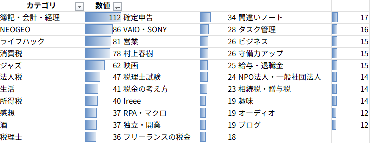 記事の分布を眺めると、会計ソフト周りのものが多いです。