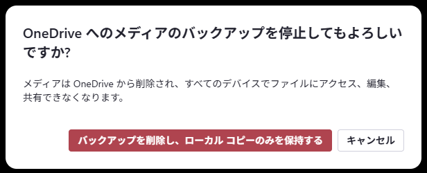 OFFにすると、ダイアログボックスが出てきますが、「バックアップを削除し、ローカル コピーのみを保持する」をクリック。